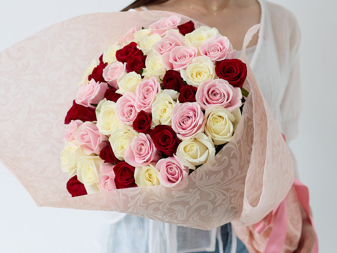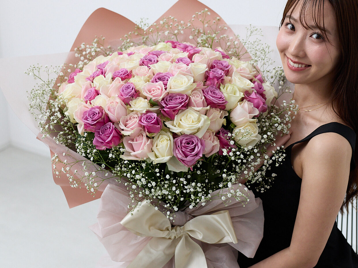 白・ピンク・紫などの3色以上のバラが織りなす、気品とやさしさのミックスカラー。