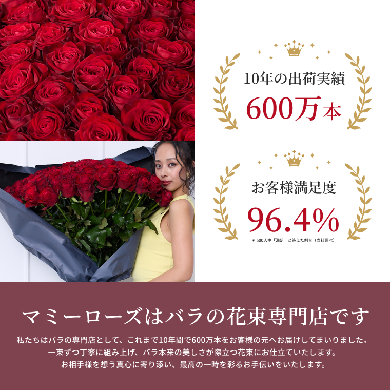 1日おきに全国の市場から厳選したバラを仕入れて、新鮮なバラの花束で感動を皆様へお届けしております。お届けは3分咲き程度のお花ですので、花瓶に入れて開花をお楽しみいただけます。